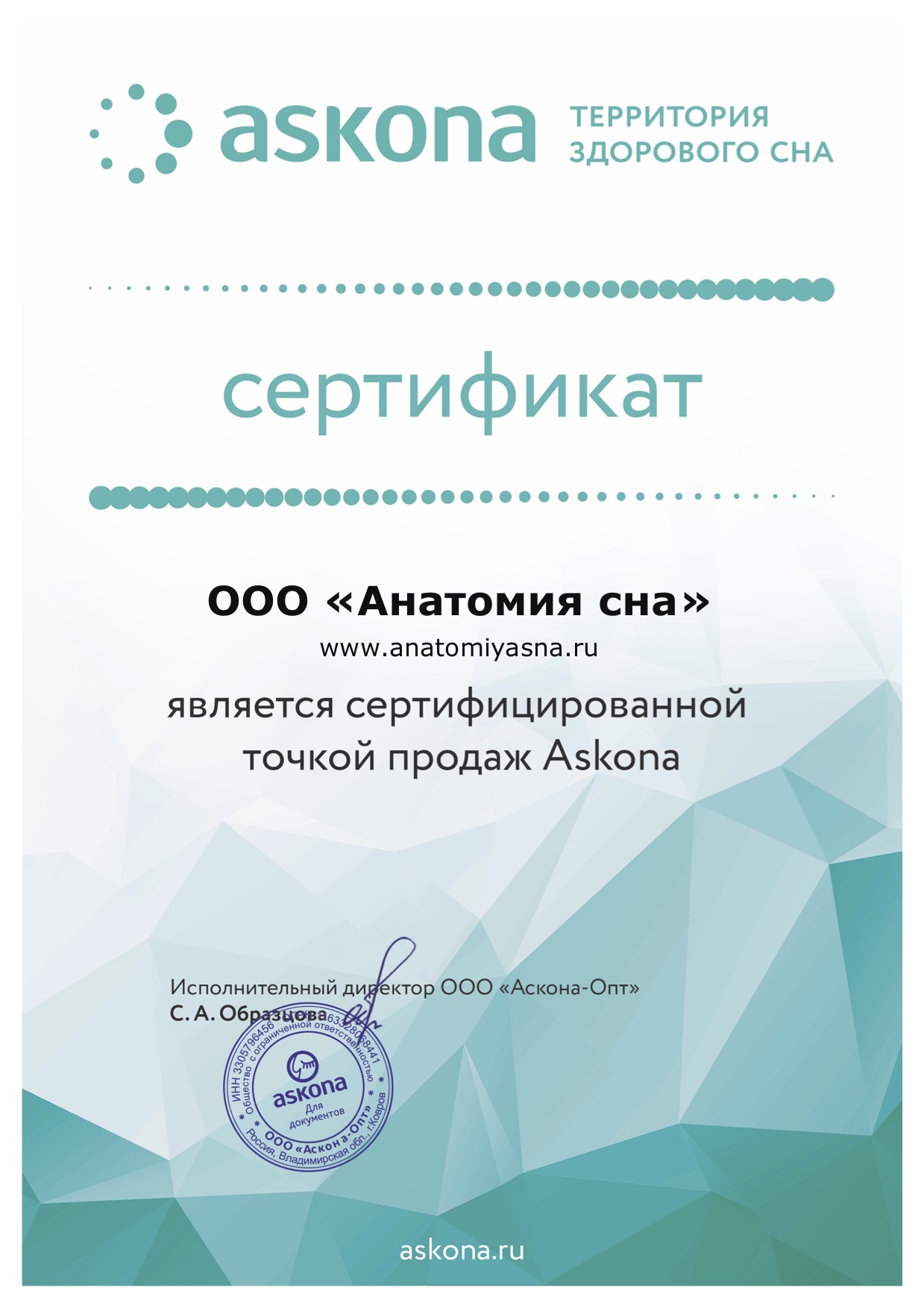 «Анатомия сна» – европейское качество, доступное сегодня каждому! На протяжении 9 лет мы обслуживаем покупателей по всей России. За этот период мы смогли завоевать доверие на отечественном рынке. Многолетний опыт, слаженная работа команды компании, безупречная репутация, множество положительных отзывов от новых и постоянных клиентов, позволяют нам сегодня предложить покупателям наилучшие условия обслуживания, включая разумные цены и развитую логистику. Также мы открыты для сотрудничества с оптовыми заказчиками и производителями.
